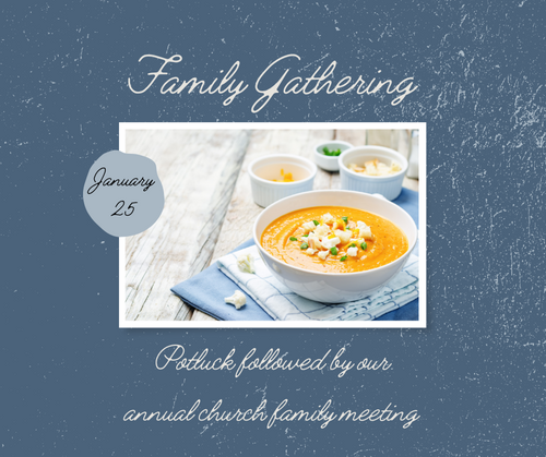The whole family is invited to our next Family Gathering on Sunday, January 25th following the worship service. This will be a true potluck...please bring a dish to share! After the lunch we will have a family meeting to vote on the proposed budget and go over a few church family updates.